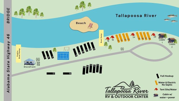 Welcome to our RV & Outdoor Center, right beside the beautiful Tallapoosa River. Our spacious RV spots give you the best of both worlds: the comforts of your RV and the natural beauty of the riverfront. Set up camp, listen to the calming river sounds, and start your day with a sunlit view over the water. If tent camping is more your style, we have the perfect spots for that too. Either way, you're in for a treat with easy access to all our amenities and outdoor activities. So pack up your RV or tent, and let's make some riverside memories!
